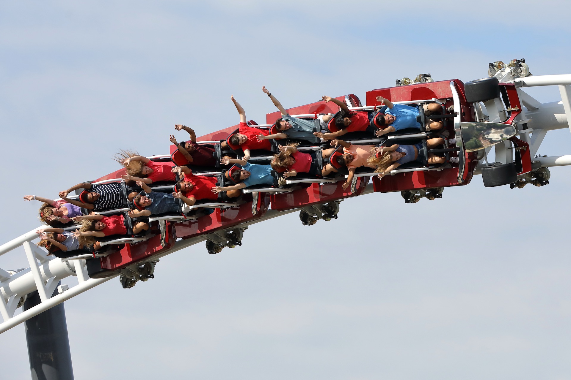 Pull across the seat belt, push down the lap bar-only restraint and the race car lurches out of the station slowly just like a Formula 1 race car leaving the pit. As the catch car mechanism hooks into the lead car, tensions rise. Unlike other launch rides of its kind, riders receive no warning.