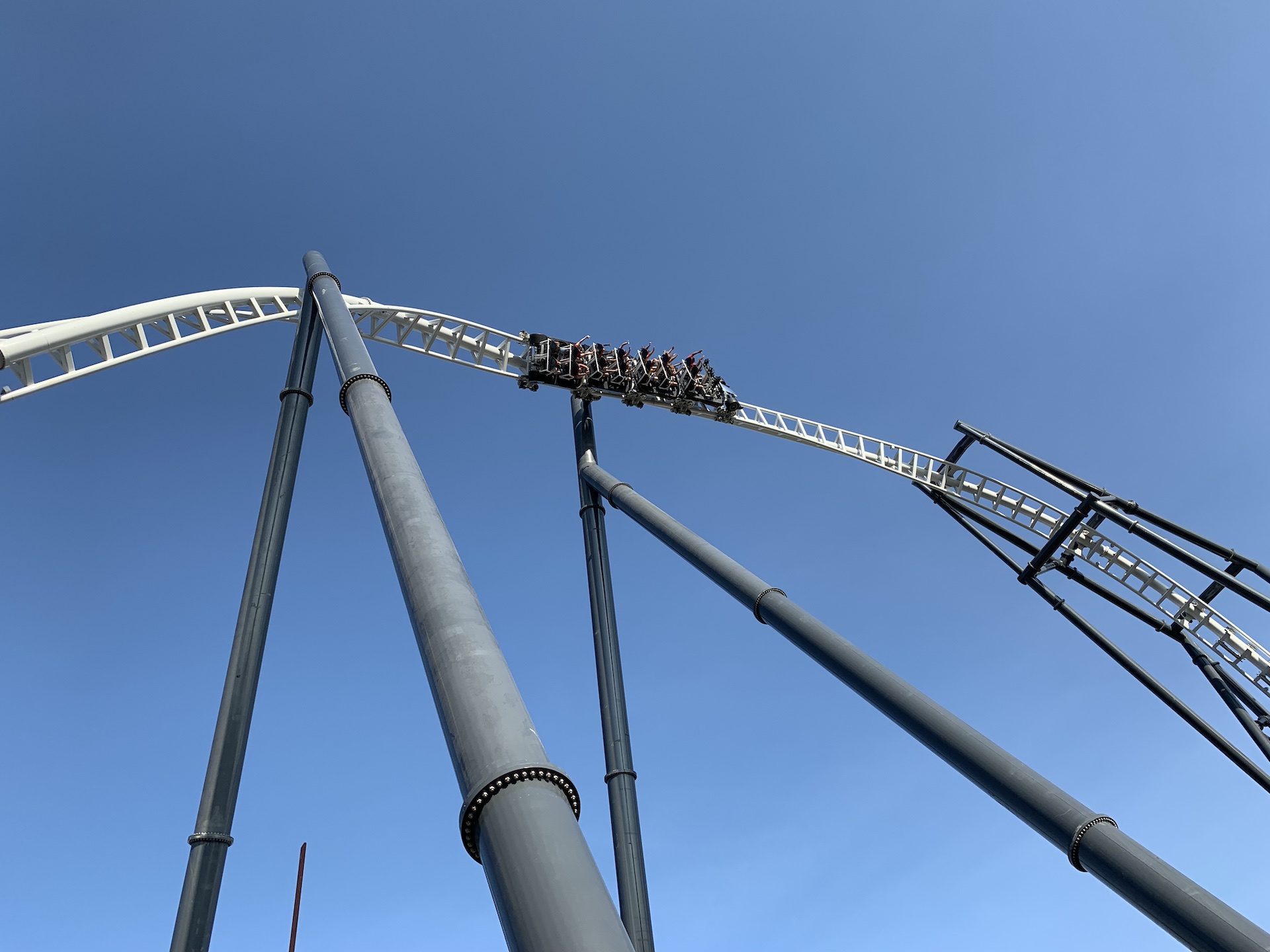 The rider is launched off the starting line, feeling a large explosion as the air pressure pushes riders to 78 mph, faster than any street-legal car on the road. Inversion after inversions happen quickly, barely allowing anyone the chance to compute exactly what is happening. Not a moment occurs in the 22-second sensory experience when the rider is waiting for something to happen. Maxx Force is extremely smooth, and the inversions aren't remotely jarring. Finishing up the course happens with a unique brake run down the backside of an inversion, the last of five.
