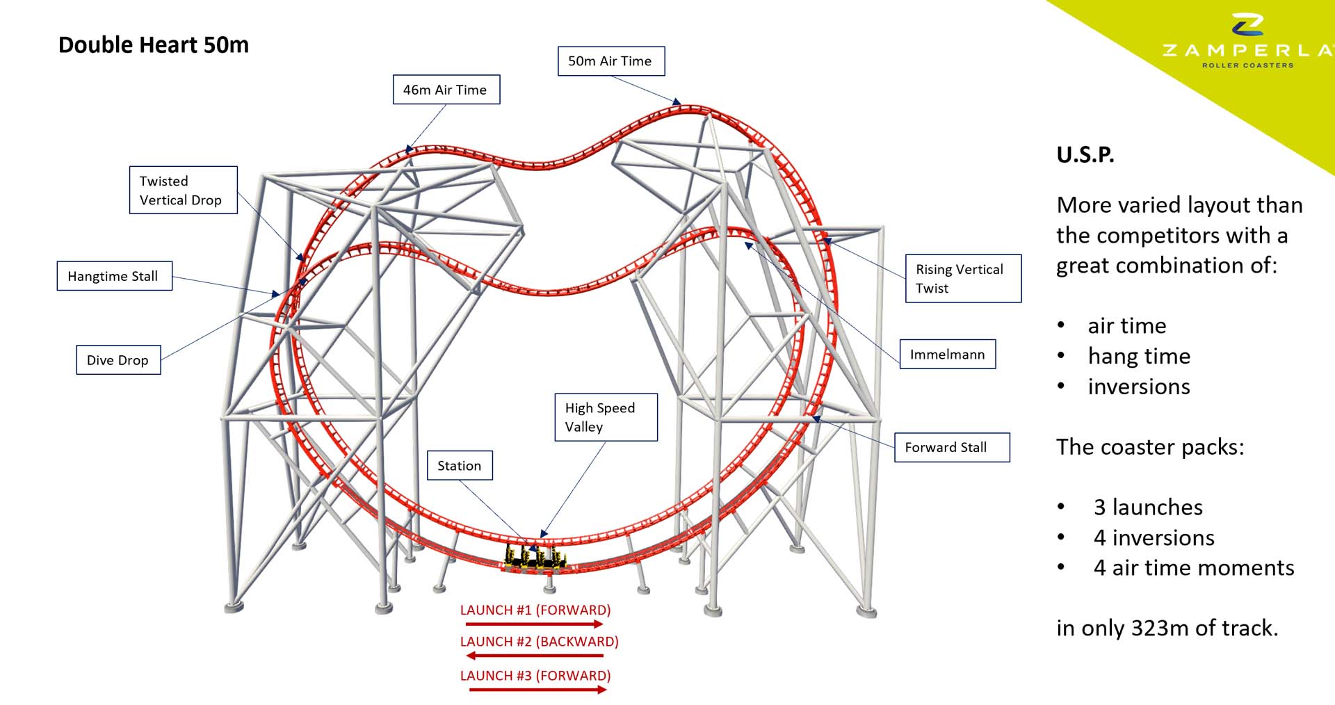 Named Double Heart Lightning, this new product has some familiar elements that ACEers will begin comparing immediately. Compact multilaunch coasters have been around close to a decade, but this Zamperla installation boasts some differences. It also comes in two sizes to make the investment fit a particular park’s budget.