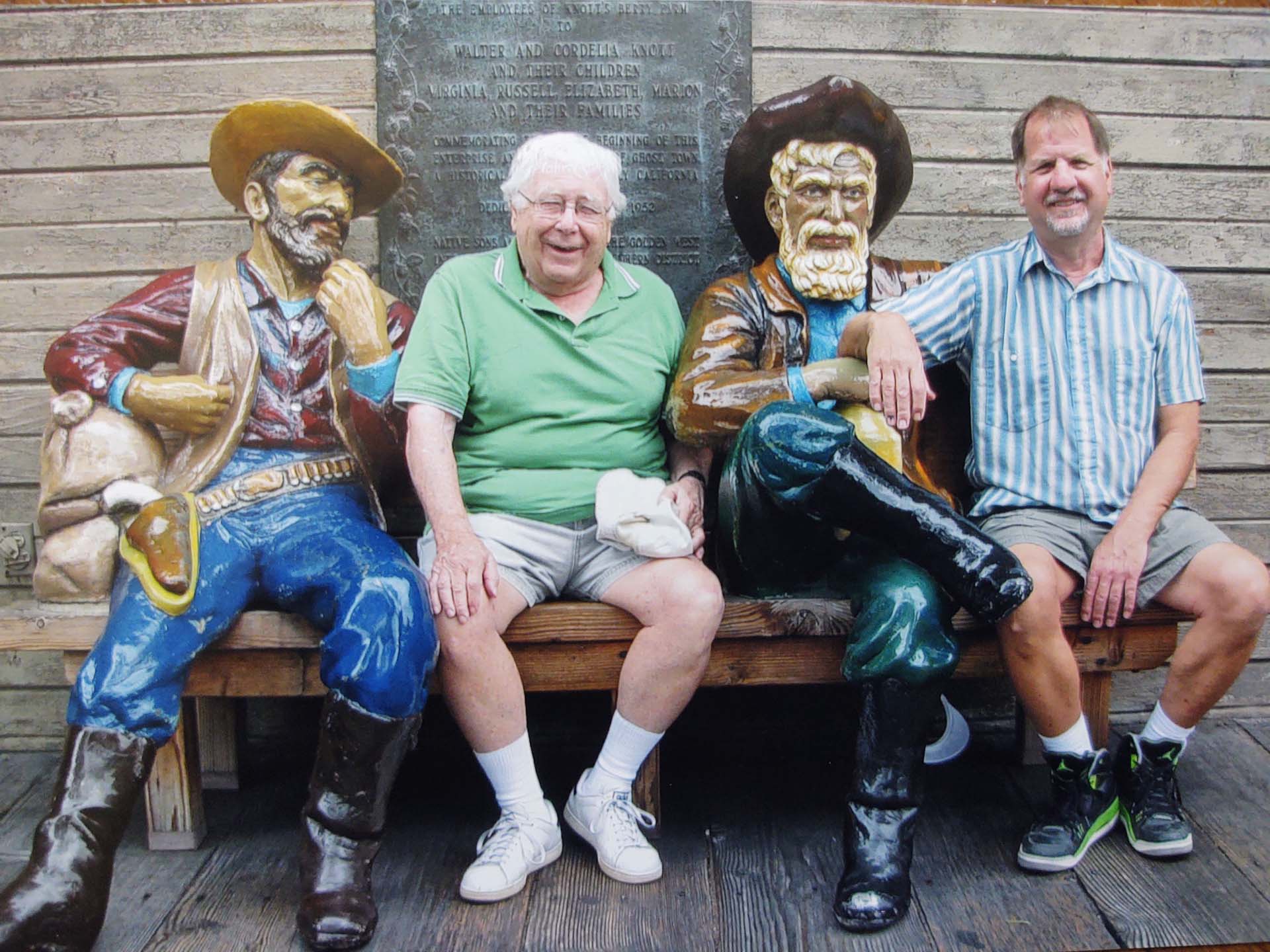 Paul Ruben and Gary Kyriazi pose with strangers at Knott’s Berry Farm.