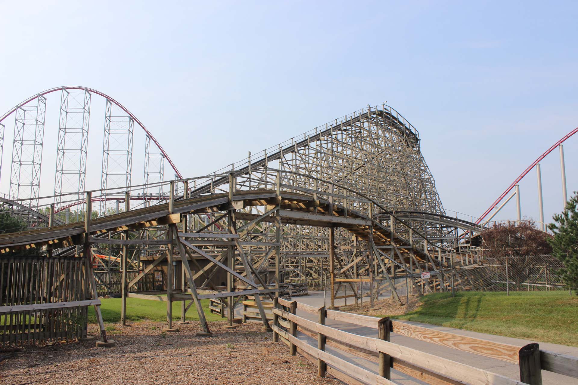 The hot and humid day began well before the park opened with cooling towels for everyone given by Worlds of Fun. Once everyone had a towel, attendees were off to Timber Wolf for an exclusive behind-the-scenes tour that took the group into off-limits areas like the carpentry shed, underneath the station and into the ride itself. After chatting with Timber Wolf’s maintenance staff, it was off for more world-spanning adventure with a walk around the park and lots of history.