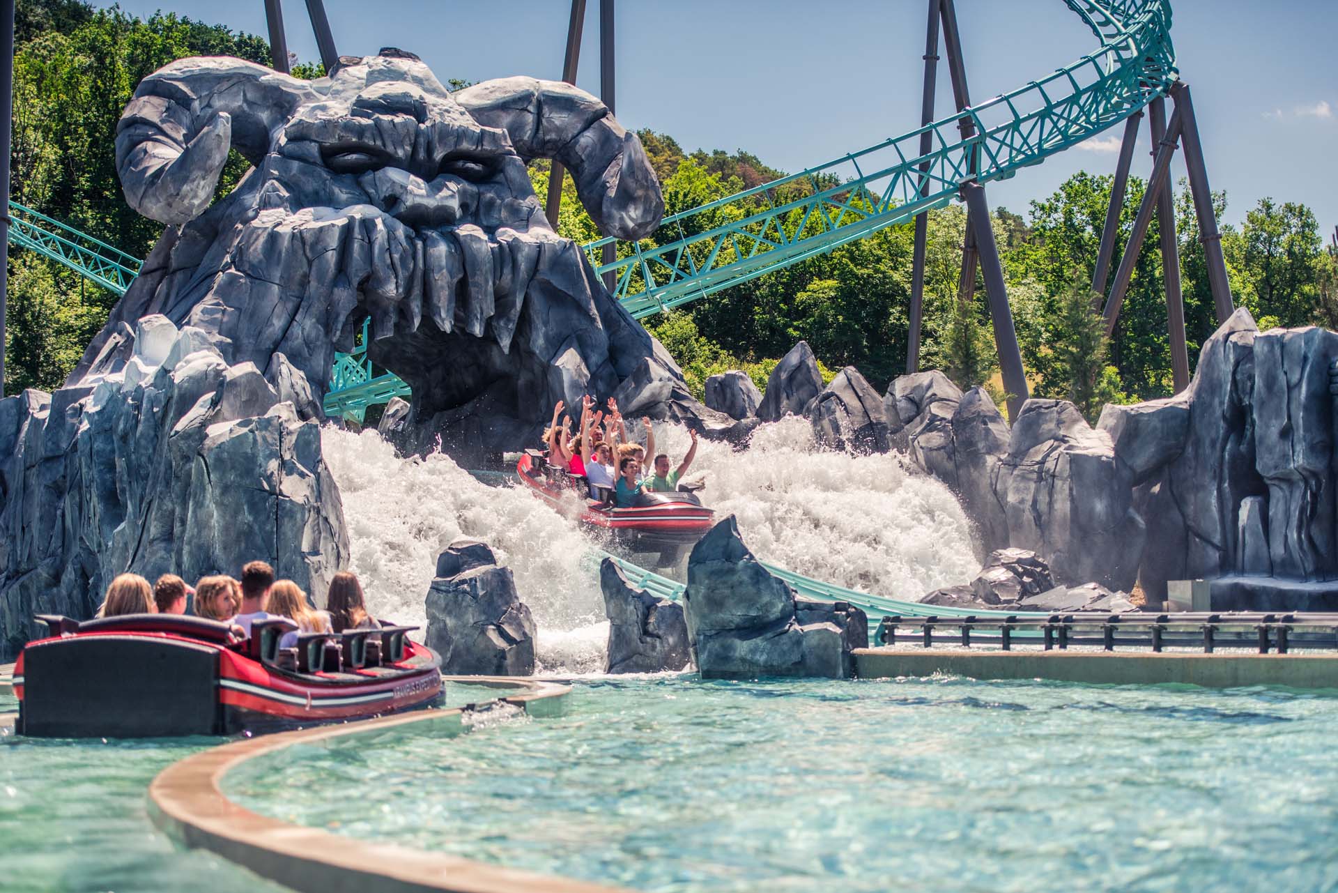 Add to all this the newest cousin. Krampus Expédition is about half and half in terms of floating in a flume channel and utilizing sections of roller coaster. The height of the ride is 92 feet tall — considerable for a water ride. Even more impressive is the rockwork theming from Universal Rocks. Krampus is a mythical monster, but the storyline and ride experience seem more focused on rocky theming than scary effects.