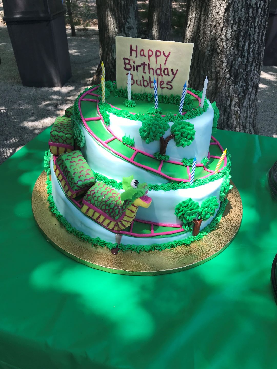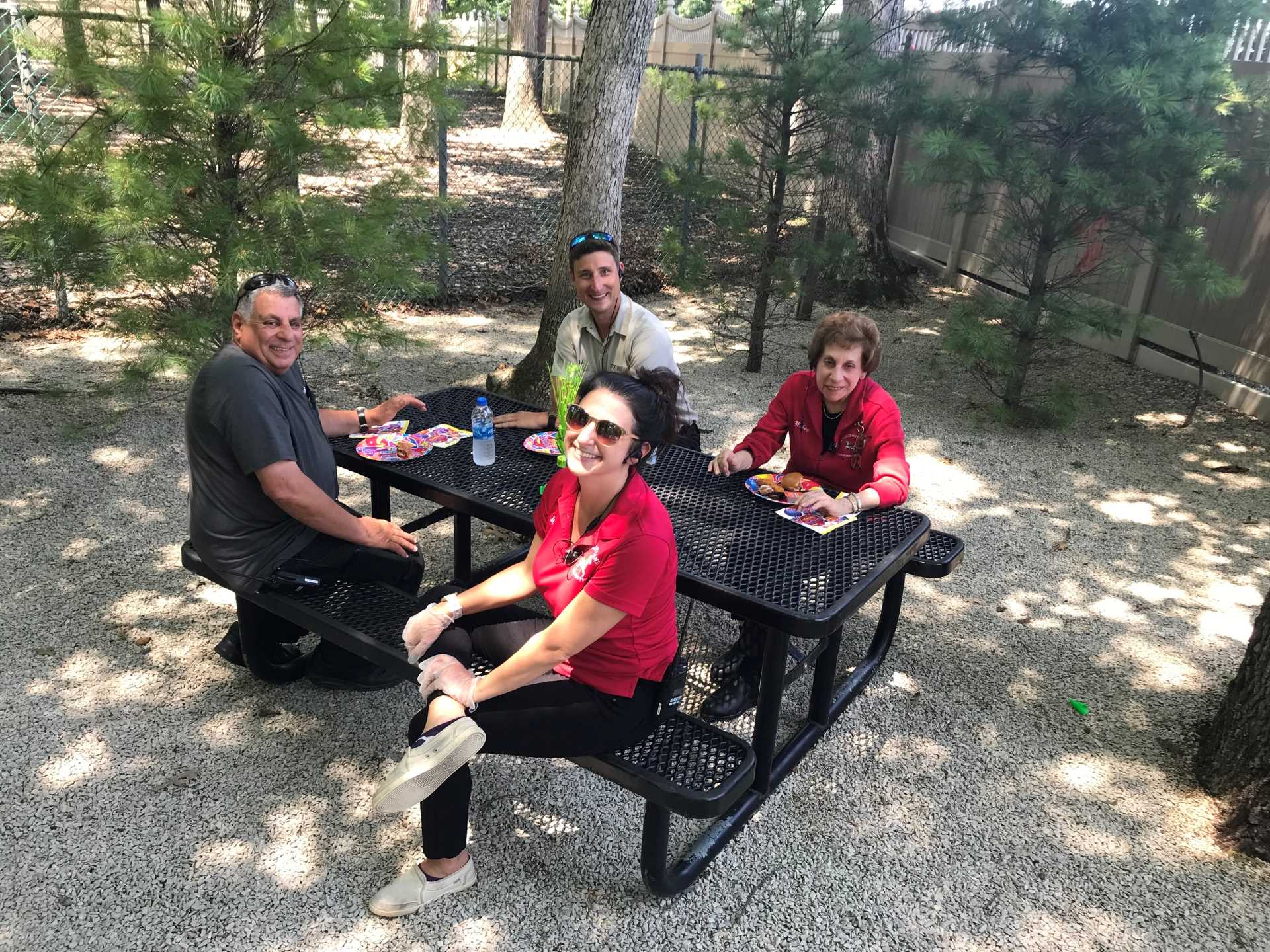 While some were wilting in the heat, Bubbles proved to be the hero of the day, making a big splashy entrance, standing for an “interview,” and sticking around long enough for every attendee who wanted a picture with Bubbles to get one. The song was sung, the candles were blown out on the fantastic green birthday cake encircled with pink roller coaster track, and Bubbles said his thanks and was off to his next adventure, which was hopefully somewhere with air conditioning. Meanwhile, ACE friends enjoyed pizza, barbecued pork, mac and cheese and cold salads among the festive surroundings — and of course, green birthday cake. Still, all were understanding when soon after lunch, most attendees gracefully found the park exit and made an escape from the hot outdoors. Besides, another outing awaited them at the beach. In any case, all lived happily ever after or at least until the next ACE New Jersey event two hours later.