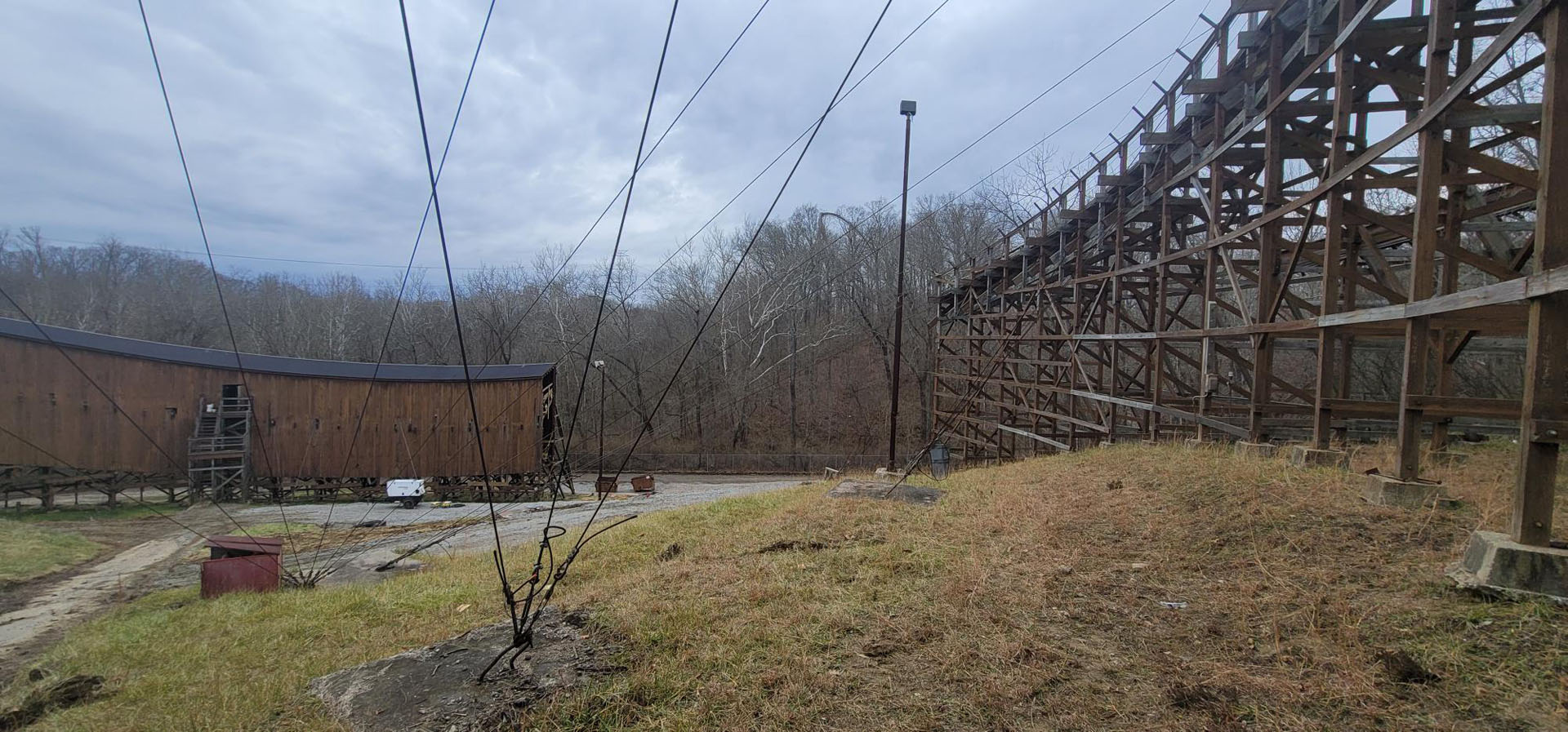 The first drop isn’t the only thing undergoing reconstruction. Part of the helix is receiving track work to help strengthen the bents that support the upper and lower track in the circular layout. The forces through the structure will be more evenly distributed to the foundation. During this process, a large section of structure has been completely removed.