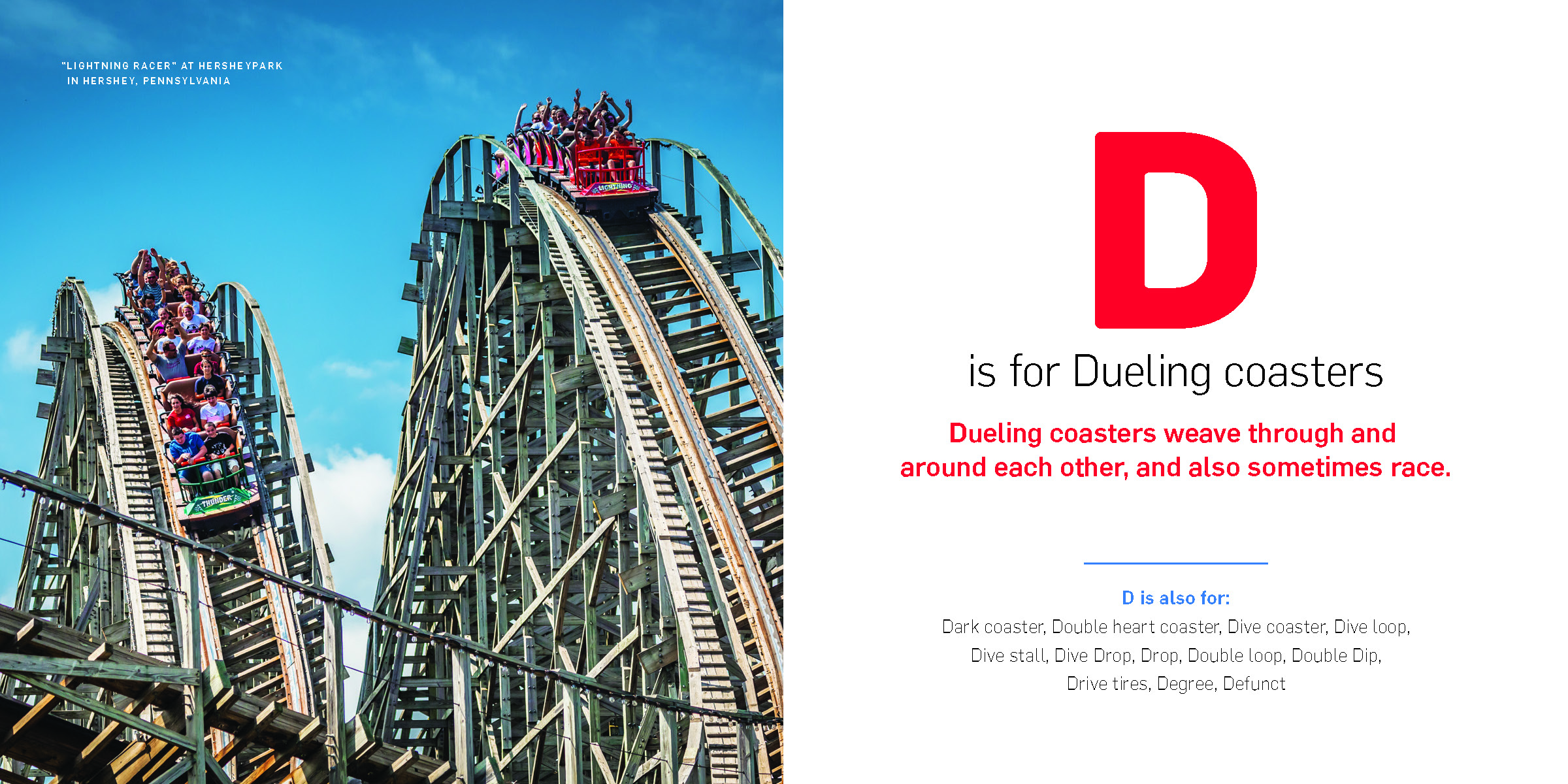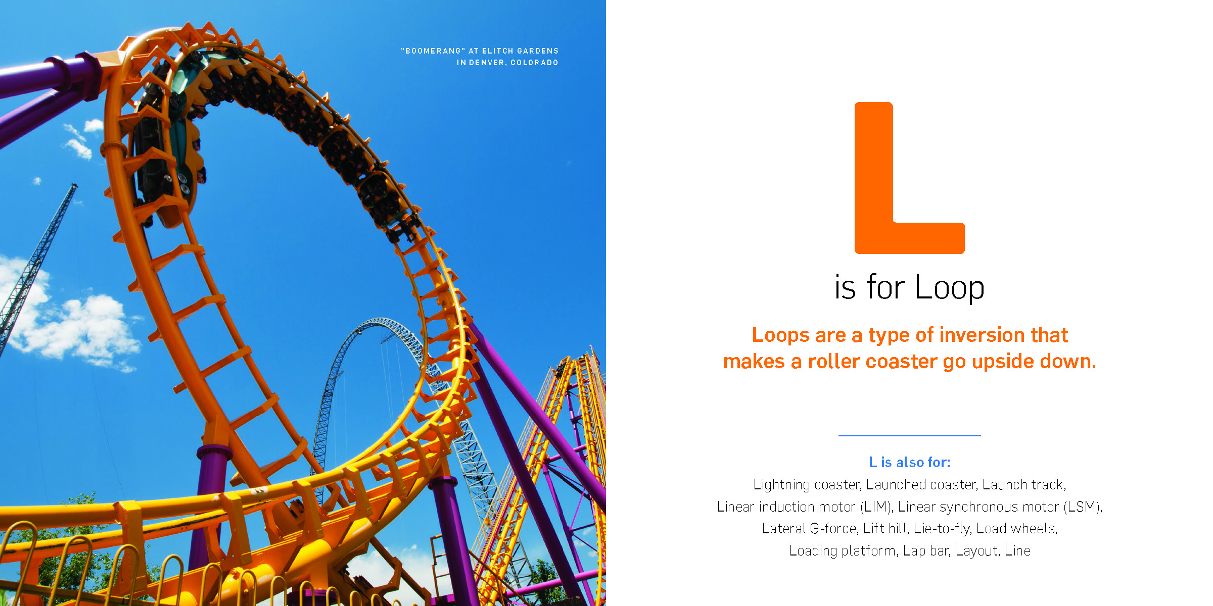 After working up lists of hundreds of coaster terms, the author took each letter of the alphabet and selected a main term to spotlight on the page. For example, “L is for loop.” Each page has a colorful photo accompanying that term. Under the main title is an extensive list of other coaster terms.
