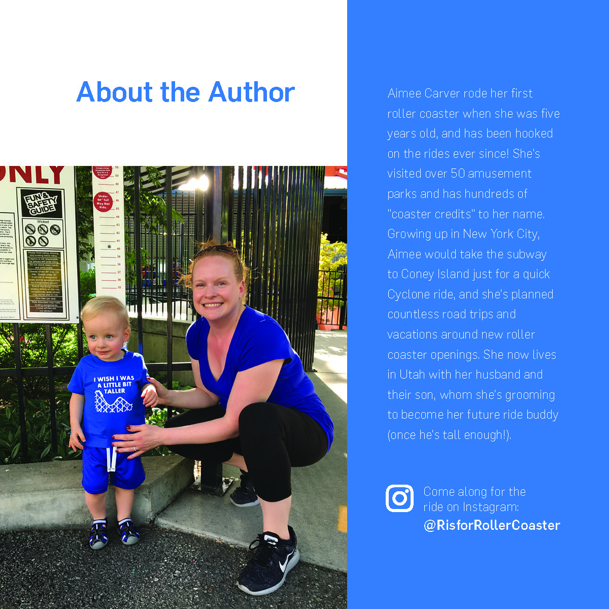 “I was inspired to publish my book in an ABC format for a few reasons. My main reason was that I'd often explain different roller coaster types, elements, etc. in basic language to my son (when we'd visit our home park, for example), and I thought it would be fun to make an exhaustive list of everything an enthusiast-in-training should know that other coaster-loving parents could draw from in order to inspire future ride buddies of their own — like I was trying to do!” Carver told ACE News. “My other reasoning behind the ABC format was that my child was young (he was three when I started this project), he was learning his letters and he gravitated towards books with big bold fonts and colorful pictures. I was inspired by other niche-subject children's books he already had that were in an ABC format (ABC NYC: A Book About Seeing New York City and New York Yankees ABC: My First Alphabet Book, for example), and I also enjoyed reading him ABC books that were a bit tongue-in-cheek like P is for Pterodactyl. I took what my son liked as a toddler, projected a bit into what I thought he would like once he was reading and also took into account what I liked reading to/with him as a parent.”