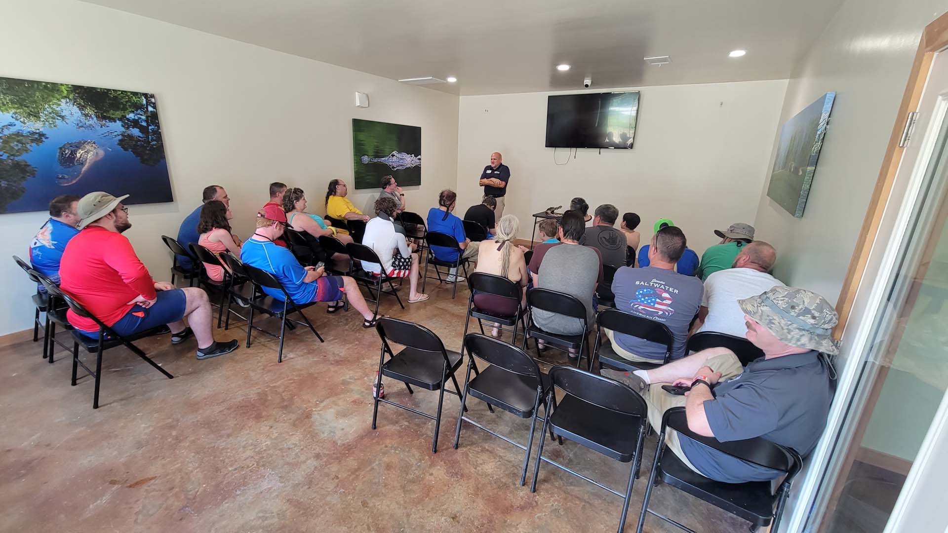 Owner Monty Galland speaks to ACE members during an afternoon break.