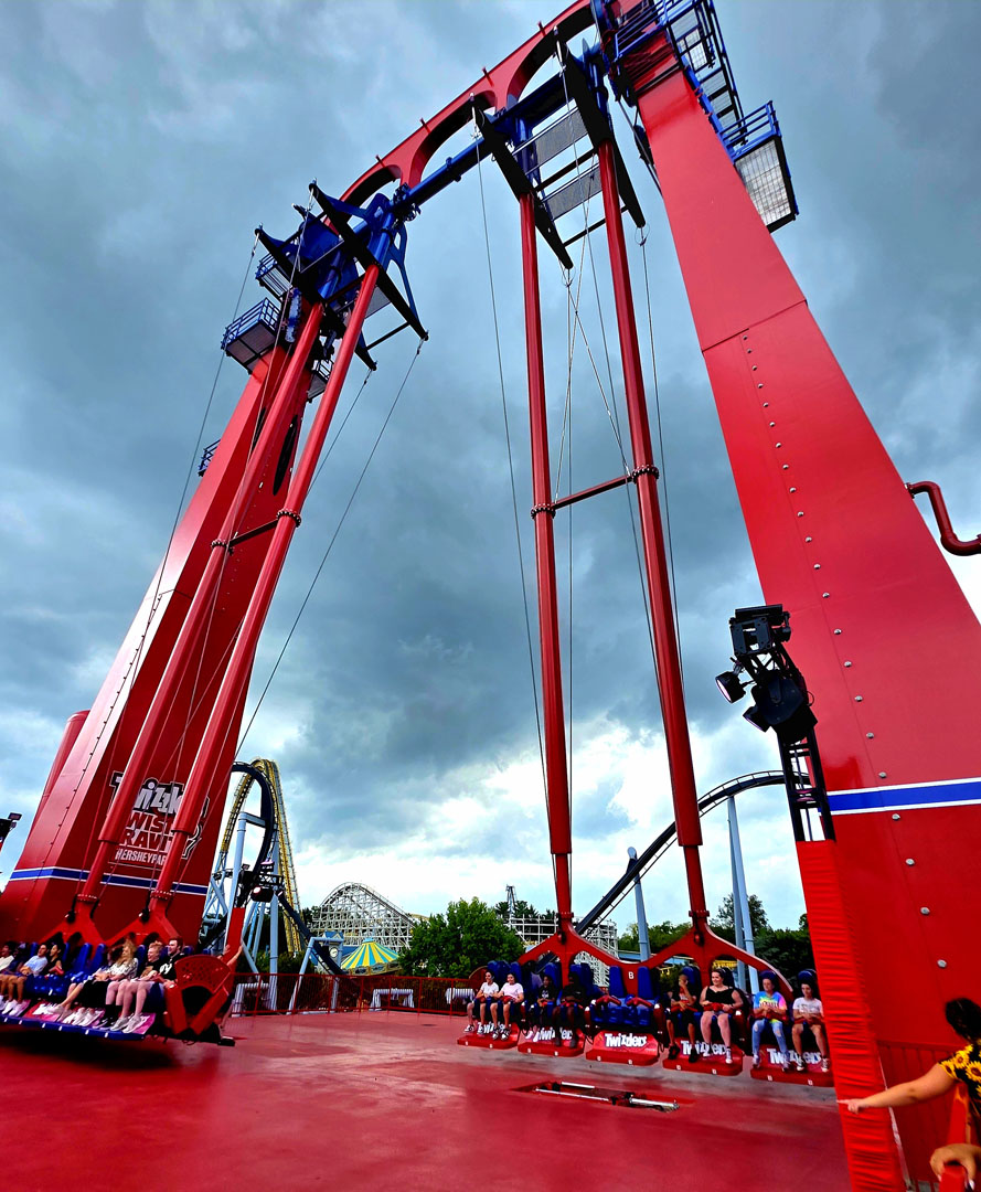 After ACE members and their guests checked in, the day began with an hour-long “Sweet Start,” which is Hersheypark’s early entry for season passholders and other guests. During this time, participants could ride four roller coasters, among them the Intamin wing coaster Skyrush and Comet (a wood ACE Roller Coaster Landmark), and various flat rides, including the new-for-2025 Twizzlers Twisted Gravity.